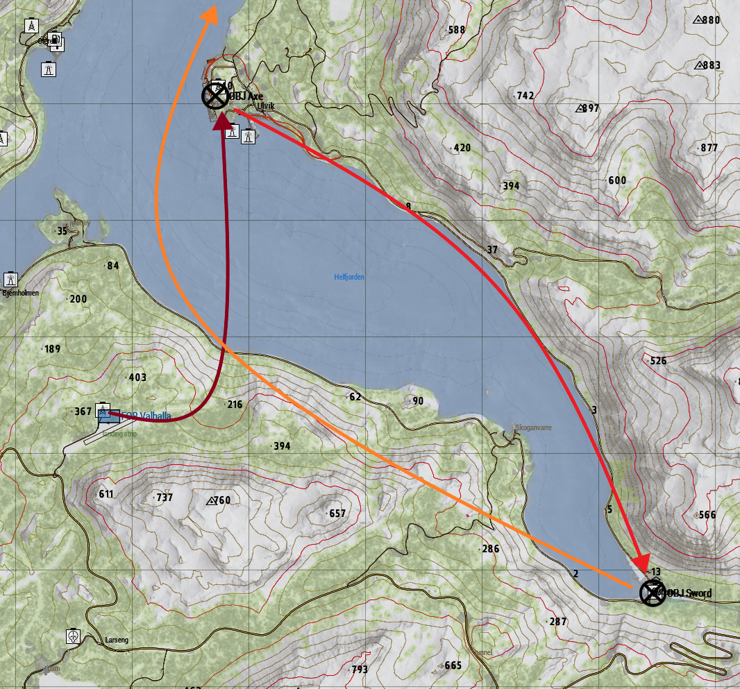 Air assaults will take place along the coastal towns and POIs. Demolition charges must be defused at Ulvik Port (This is a priority objective) before following air assaults in other areas to assist friendly forces. Echo fixed-wing remain clear of the enemy fleet should not attack until they are cleared to do so following completion of OBJ Sword.