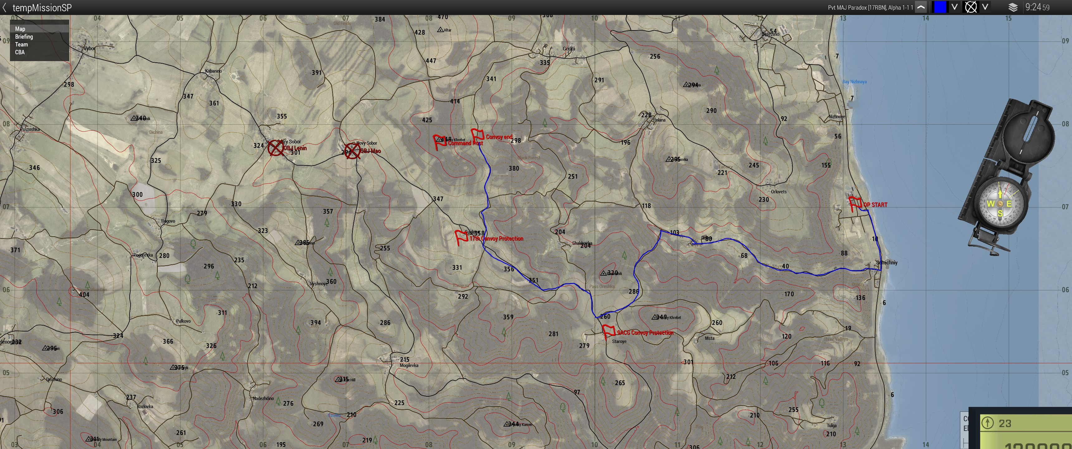 Ground forces will convoy through the town of Staroye and turn north of Guglovo, stopping at Lesnoy Khrebet to setup a command post outside of Novy Sobor. Mortars and support from friendly ground forces will allow for the push into the towns. A detachment of 9ACG forces will take the town of Staroye via little bird to secure it for the convoy. A detachment of 17th forces with take the town of Guglovo via little bird to secure it for the convoy.
