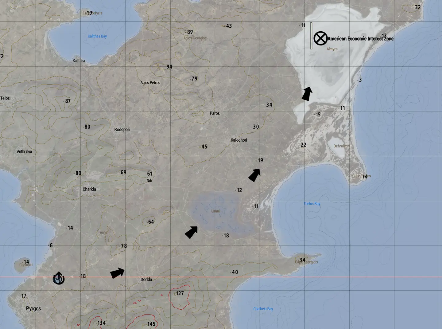 17th forces will be deploying from the Pyrgos military base and pushing though the route shown in image 1 to the American Economic Interest Zone, where they will proceed to clear the industrial area, and secure the civilians being held by AAF forces. Additionally, stay vigilant for the potential of an AAF counter offensive during the raid on the American Economic Interest Zone.