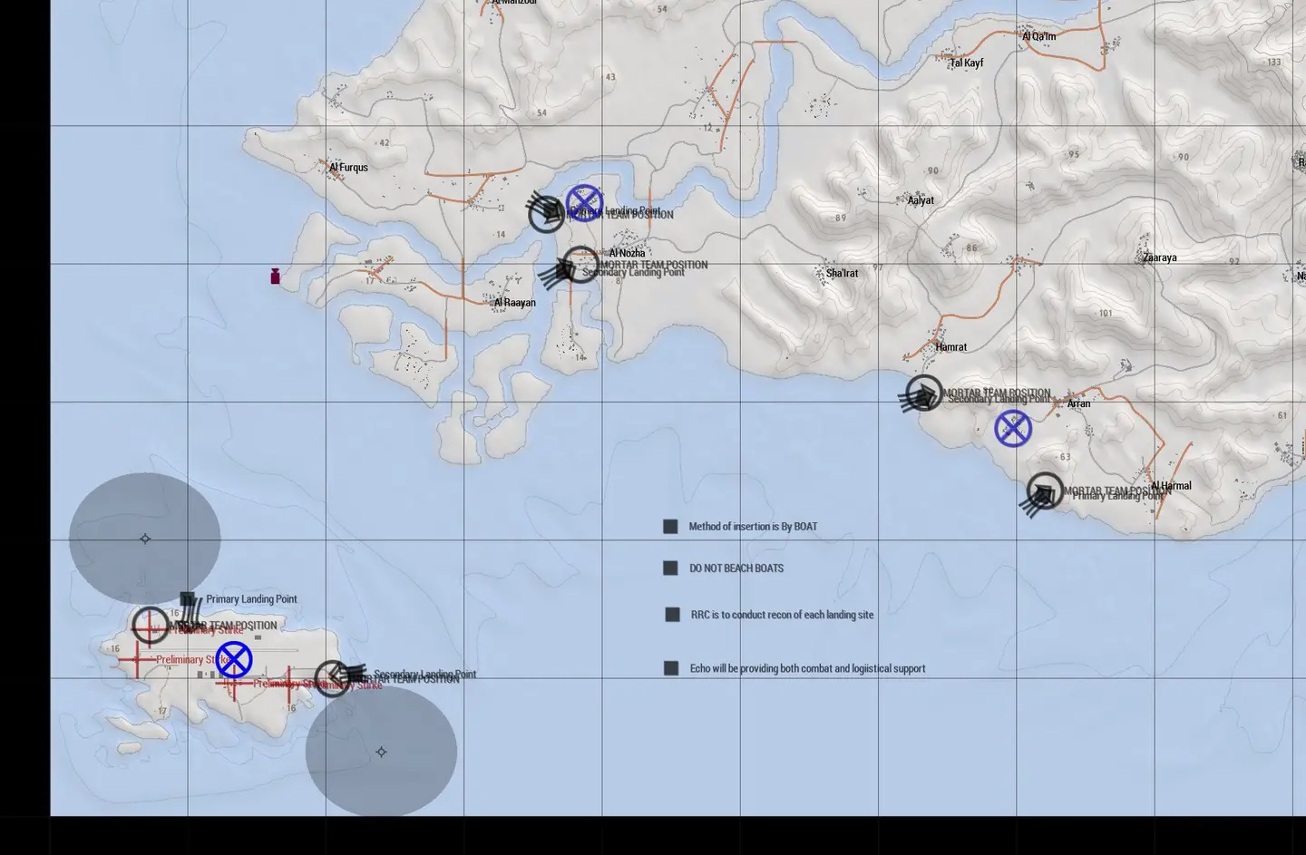 Afternoon Rangers. Loosing the city of Jableh has given CSAT the upper hand, and we have intel coming in that it may have been a trap from the start. More importantly, our Marine friends are now cut off from the main forces and have CSAT on all sides. However, with a majority of CSAT forces currently focused on the Marines, we have been given a golden opportunity to exploit a critical weak point in CSAT's defenses. If we can push through this weak point and past their defenses, we can not only create a hole for the Marines to use to get out, but we can also hit a costal CSAT battery and a CSAT controlled island off of the coast. The kicker is, these weak points won't last forever, so we're only gonna have one shot at this and we're gonna have to make it count. If we can manage this, we can regain the upper hand and put CSAT back on the defensive. Still no fixed wing, but a cyber attack is planned to temporarily disable enemy AA assets, allowing rotary assets to operate freely.